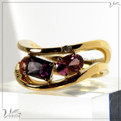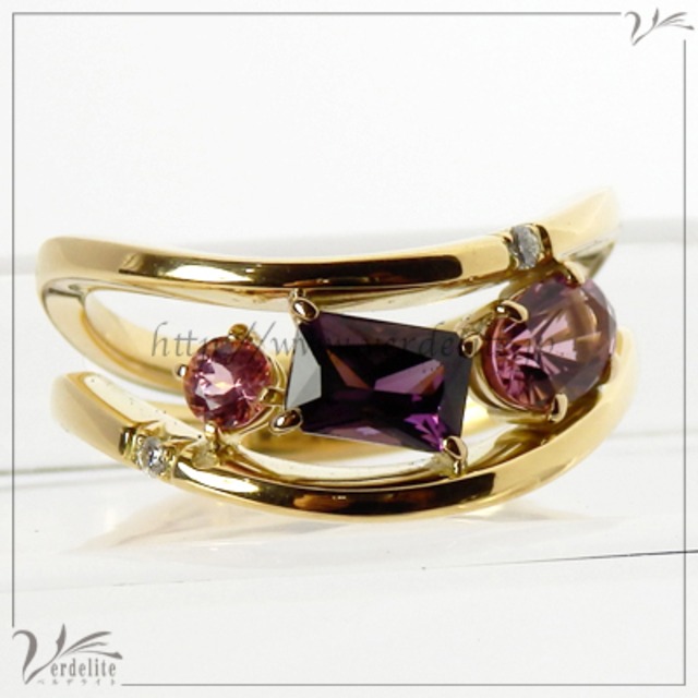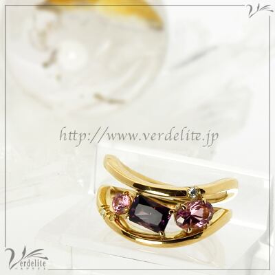 紫とピンクのスピネルを効果的にセッティングしていて、ゴールドにピンクという甘いイメージの色合いが、シックな大人のイメージのリングになっています。